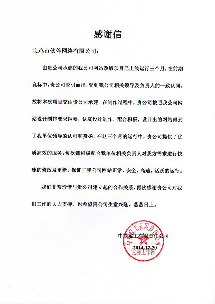 您現(xiàn)在的位置: 寶雞網(wǎng)絡(luò)公司 > 新聞動態(tài) > 公司動態(tài) > 我公司收到中鐵寶工感謝信